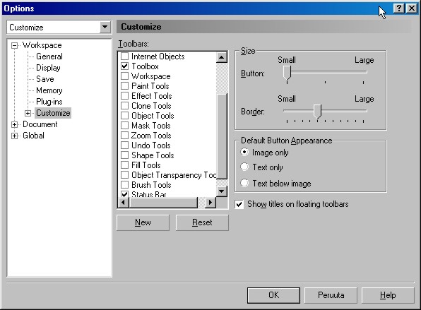 työkalupaletteja lisätään ja poistetaan.