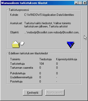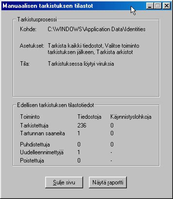 tarkistuksen tilastot, jossa todetaan ettei viruksia löytynyt.